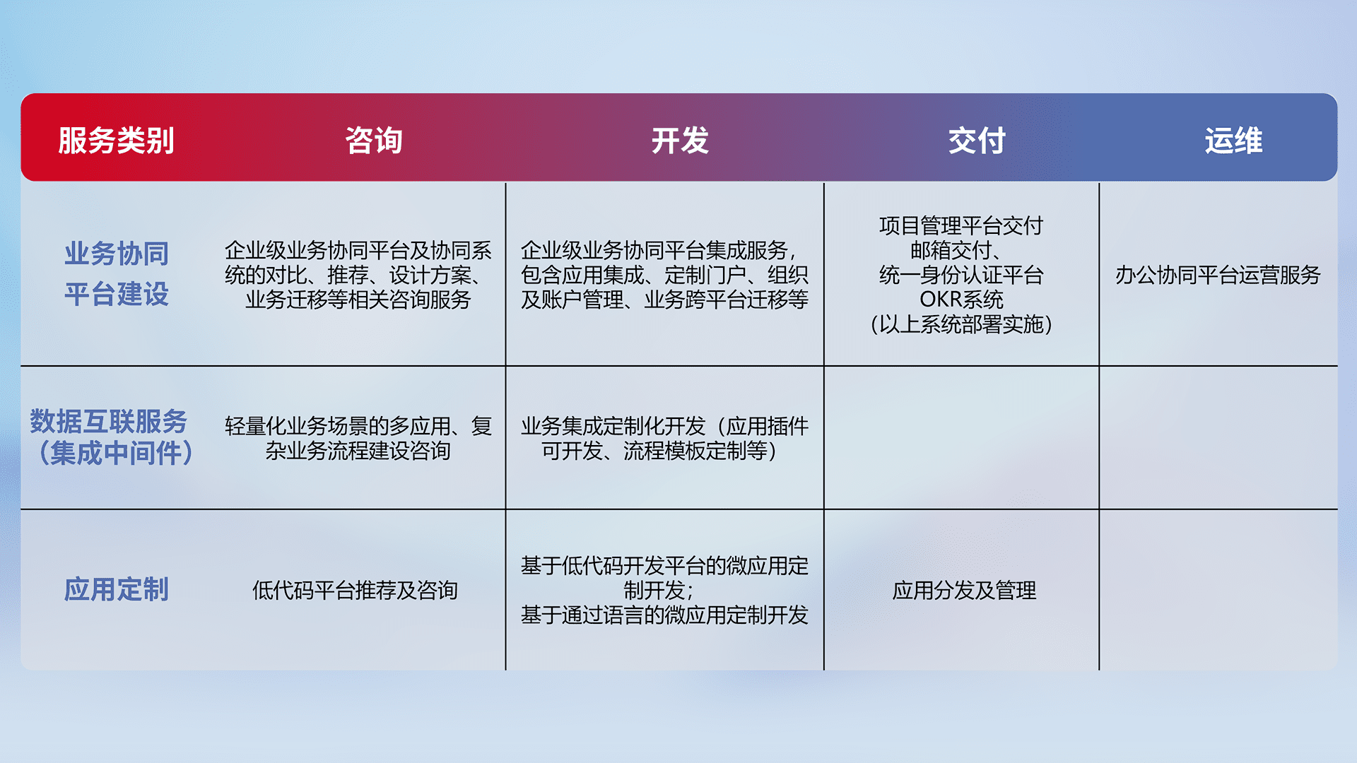 针对钉钉、、、、企微、、、、IDaas等平台级产品提供产品的规划、、、、方案、、、交付、、、、定制化开发等服务,,实现如统一协同办公、、、、智能客户服务、、、、混合会议管理、、智能数据查询、、等业务场景,,,实现数字化转型。。。